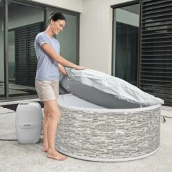 Smidigt, uppblÄsbart spabad. Ingen montering krÀvs och du flyttar enkelt badet med dess tvÄ handtag. Spabadets massagefunktion har hela 140 AirJets⹠med lugnande bubblor och en massageregulator med tvÄ olika intensitetsnivÄer och fotmassage, allt för att ge dig den ultimata avkopplingen.