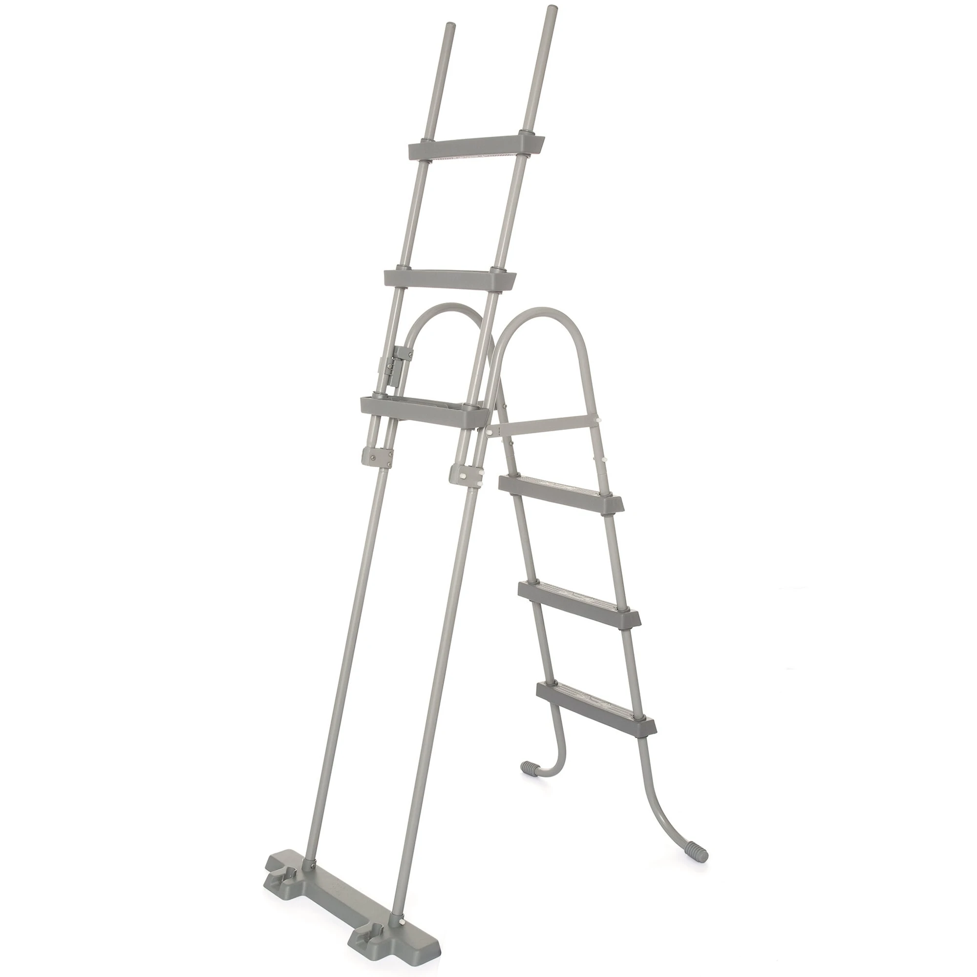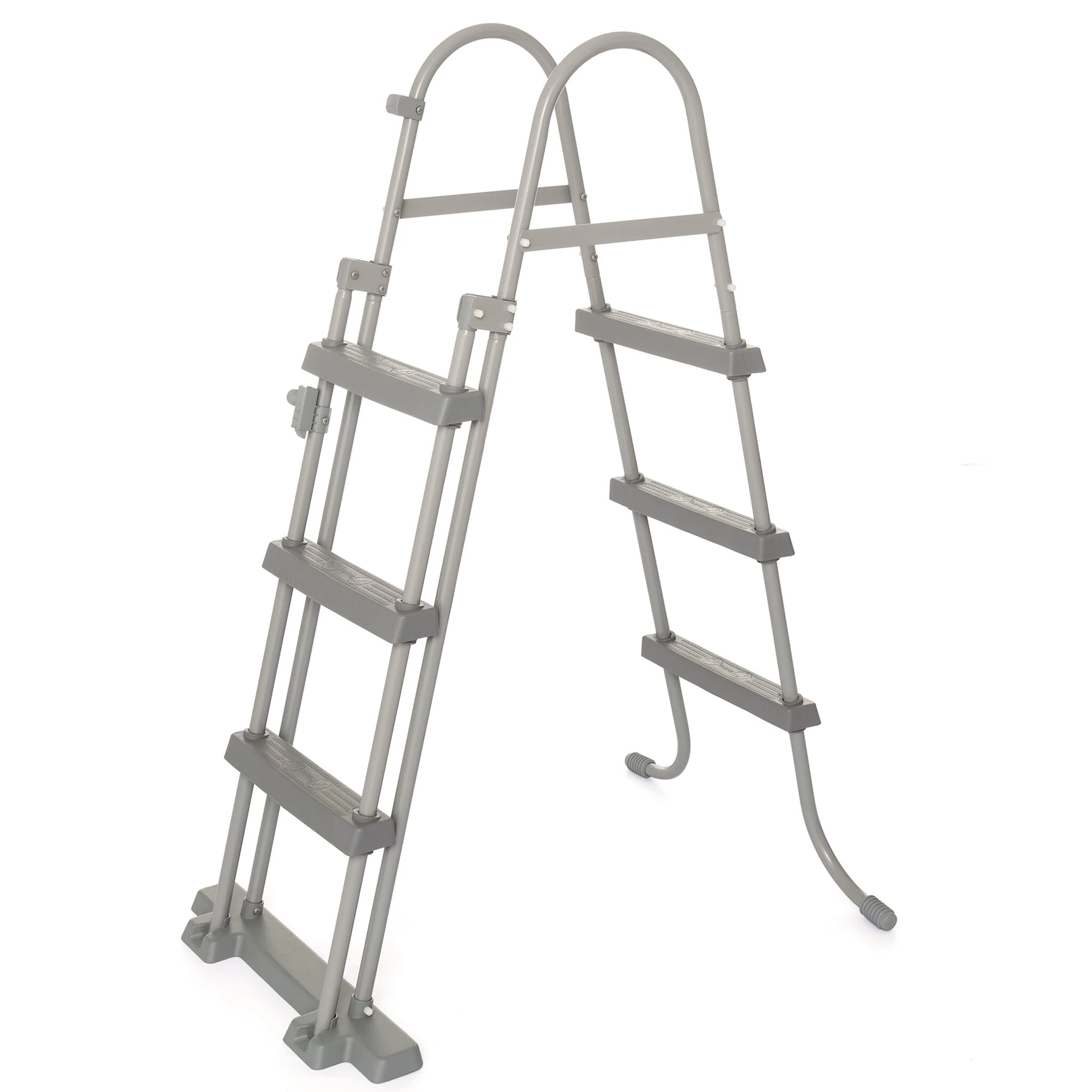 SÀkerhetsstegen Àr byggd med en rostbestÀndig, robust metallram och kan sÀkras i uppfÀllt lÀge för att förhindra att barn kan klÀttra i poolen utan övervakning.