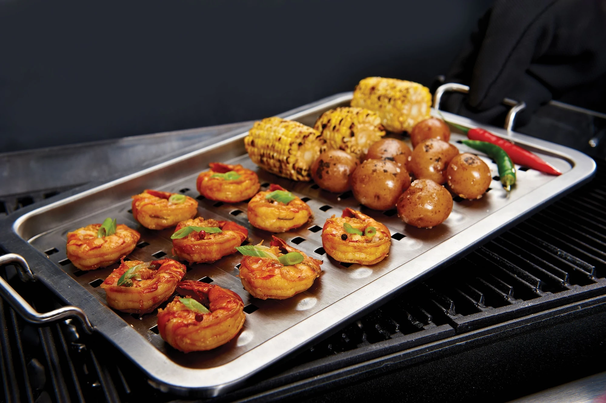 Grillbricka frĂ„n Broil King i perforerat, rostfritt stĂ„l med handtag och upphöjda perforeringar. Designen förbĂ€ttrar funktionaliteten och stabiliteten, samtidigt som den Ă€r lĂ€tt att rengöra. 48x29x5 cm.Ăppet köp i 30 dagar