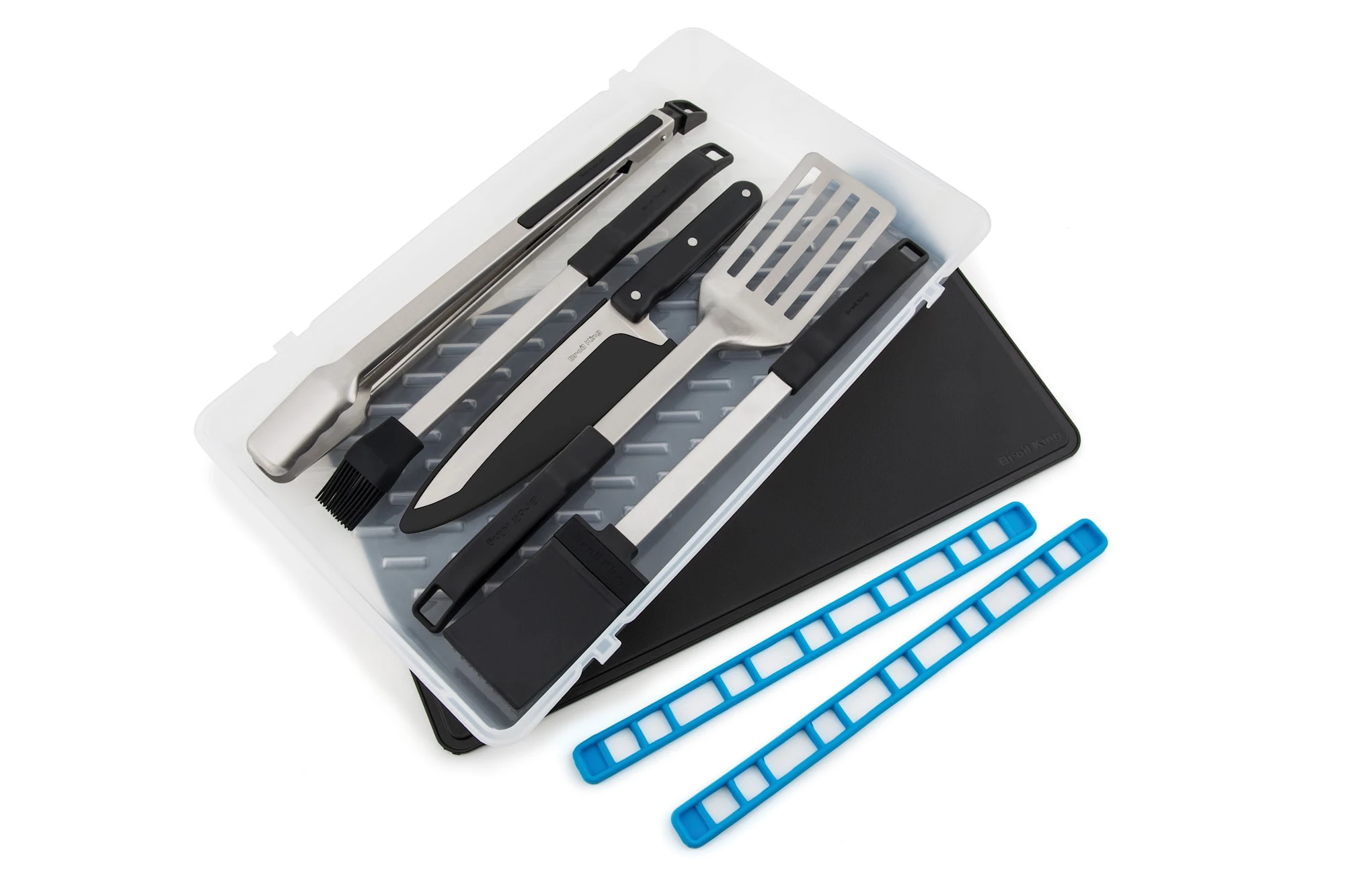 Den praktiska plastÄdan med lÄsbara silikonremmar rymmer tÄng, spade, pensel, grillborste samt en 36 cm kockkniv nÀr de Àr smutsiga och locket Àr dessutom en tvÄsidig skÀrbrÀda.