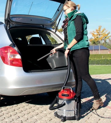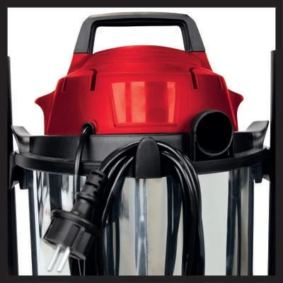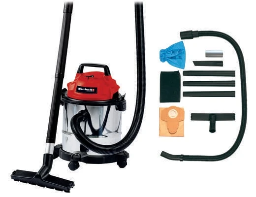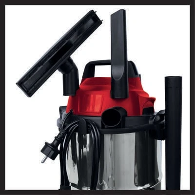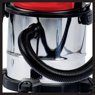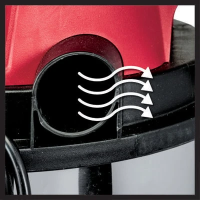 Den rostfria behÄllaren pÄ 12 liter Àr lÀtt att rengöra och samlar grov, fin, vÄt och torr smuts, till och med vÀtskor, utan att efterlÀmna nÄgra rester. Tack vare den starka motorn pÄ 1 250 Watt uppnÄs inte bara god sugförmÄga, utan dessutom alltid tillrÀckligt tryck för blÄsning pÄ svÄrÄtkomliga platser, tack vare den praktiska blÄsfunktionen. Den robusta smutspÄsen samlar pÄ ett tillförlitligt vis in Àven fint damm i systemet och dammsugning blir ett rent nöje. Under vÄtrengöring skyddar ett skumgummifilter motorn mot smuts.