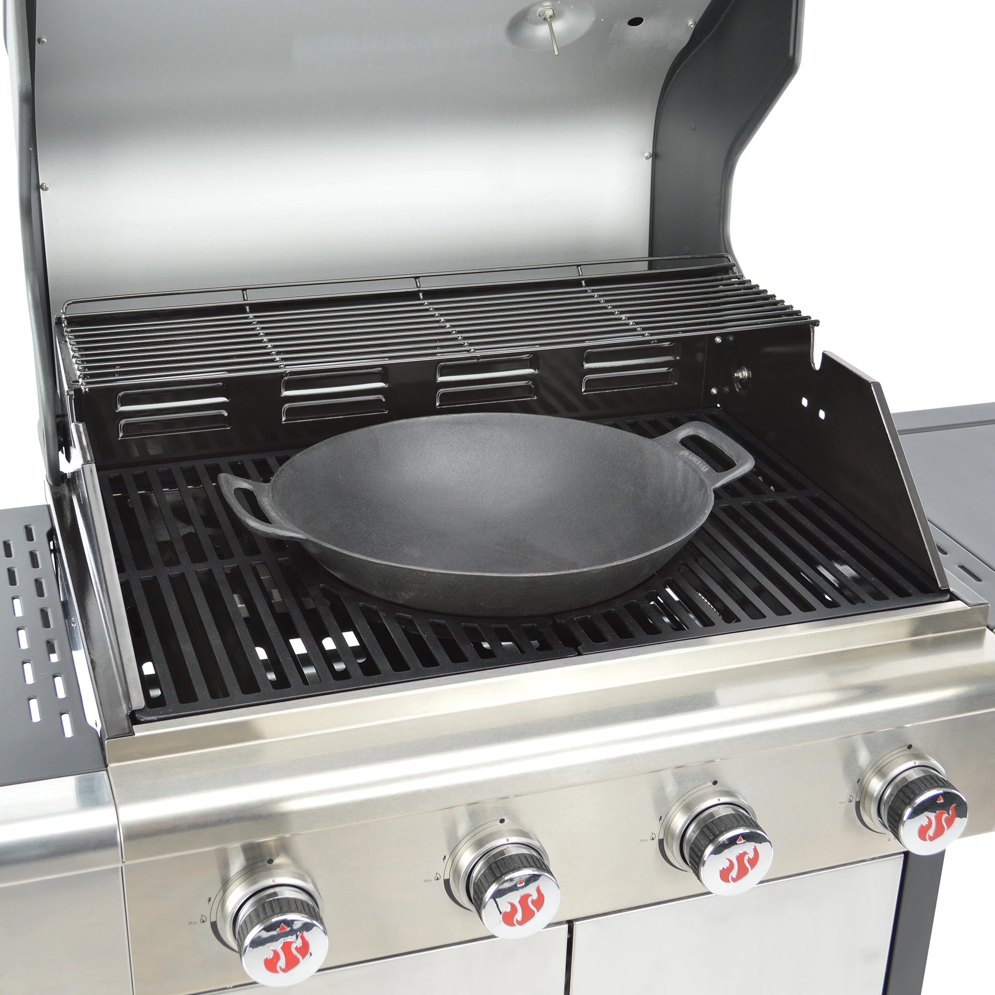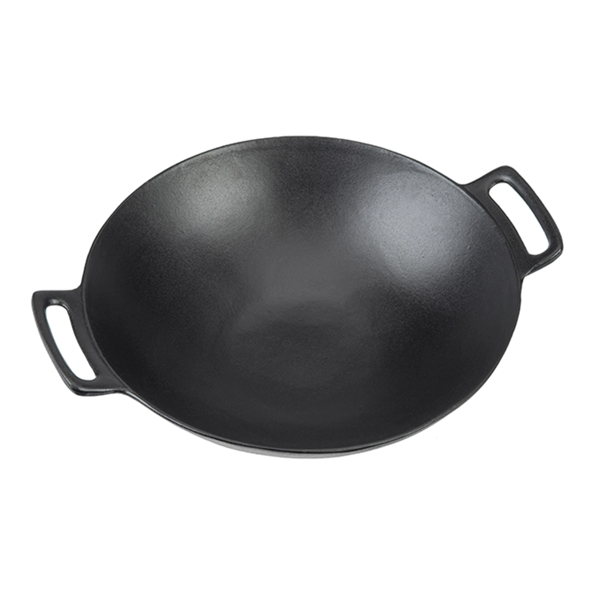 En rejÀl wokpanna av gjutjÀrn med dubbla handtag. Perfekt för tillagning av exempelvis asiatiska rÀtter, paella eller grönsaker.