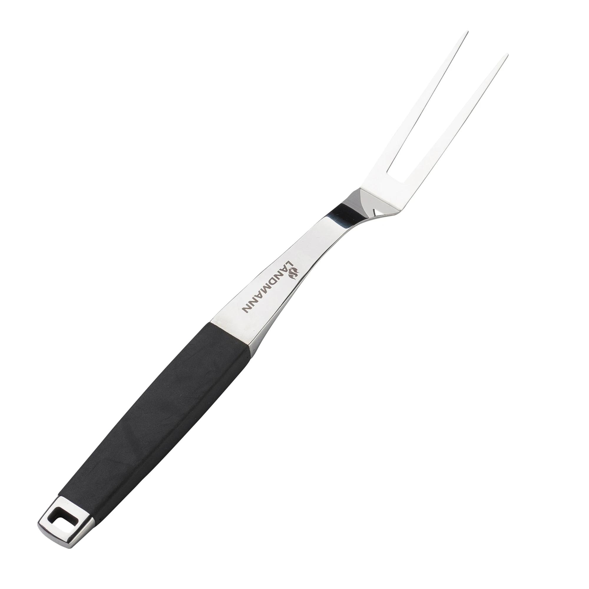 Snyggt designad grillgaffel med ett skönt gummerat handtag. UnderlÀttar mycket nÀr den fÀrdiggrillade köttbiten ska skivas upp. Tillverkad av rostfritt stÄl.
