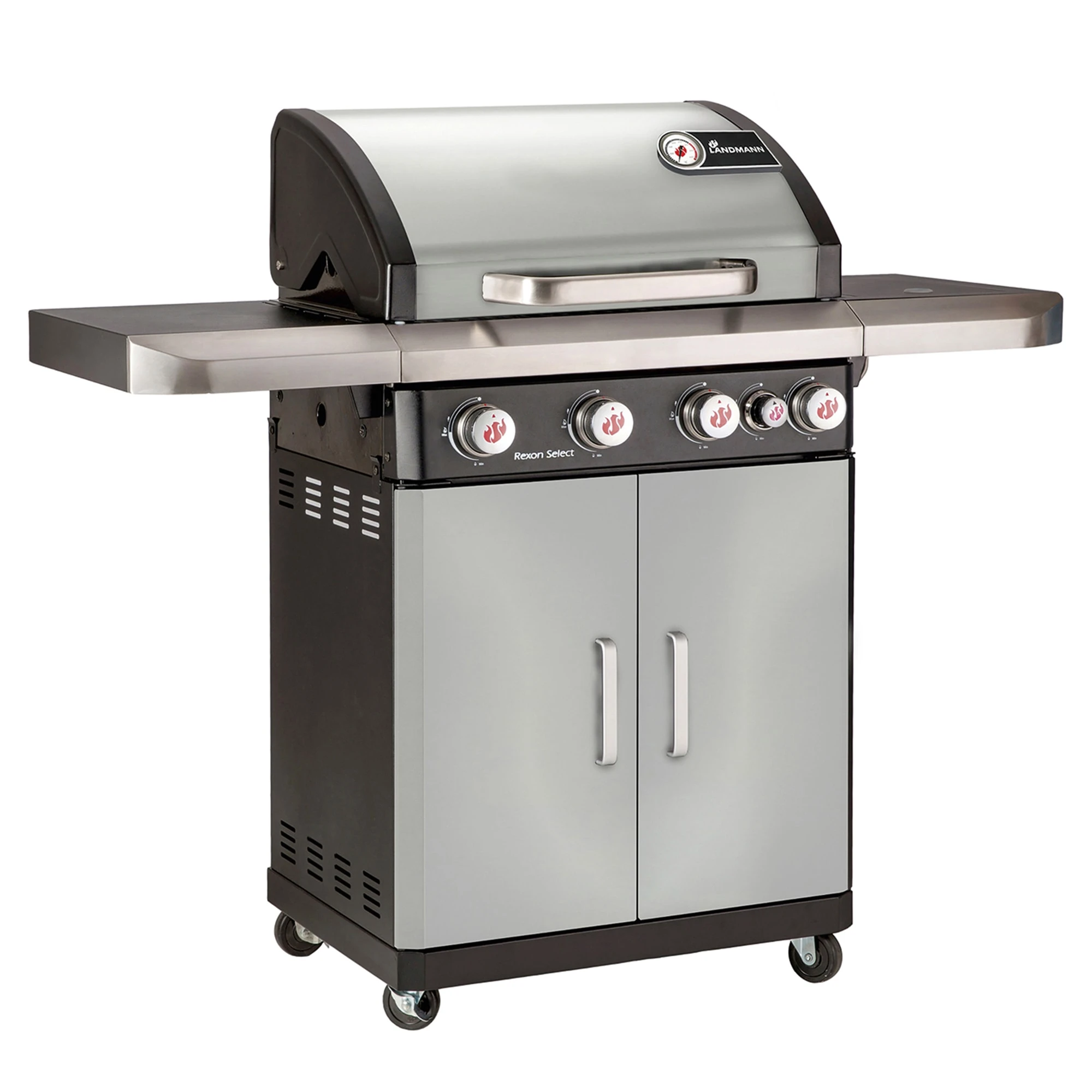 RejÀl gasolgrill förberedd för Modulus-tillbehör med fyra brÀnnare (vilket innebÀr extra hög grillkapacitet) i rostfritt stÄl och kokplatta pÄ ena sidobordet för tillredning av mat i stekpanna, kastrull eller wok.