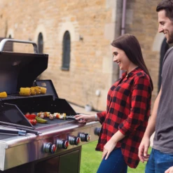 Premiummodell med fyra brÀnnare (vilket innebÀr extra hög grillkapacitet) i rostfritt stÄl och kokplatta pÄ ena sidobordet för tillredning av mat i stekpanna, kastrull eller wok.