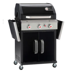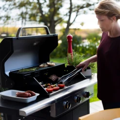 Platsbesparande premiummodell med tre brÀnnare i rostfritt stÄl. BÄda sidoborden Àr fÀllbara för att grillen ska ta minimalt med plats vid förvaring.