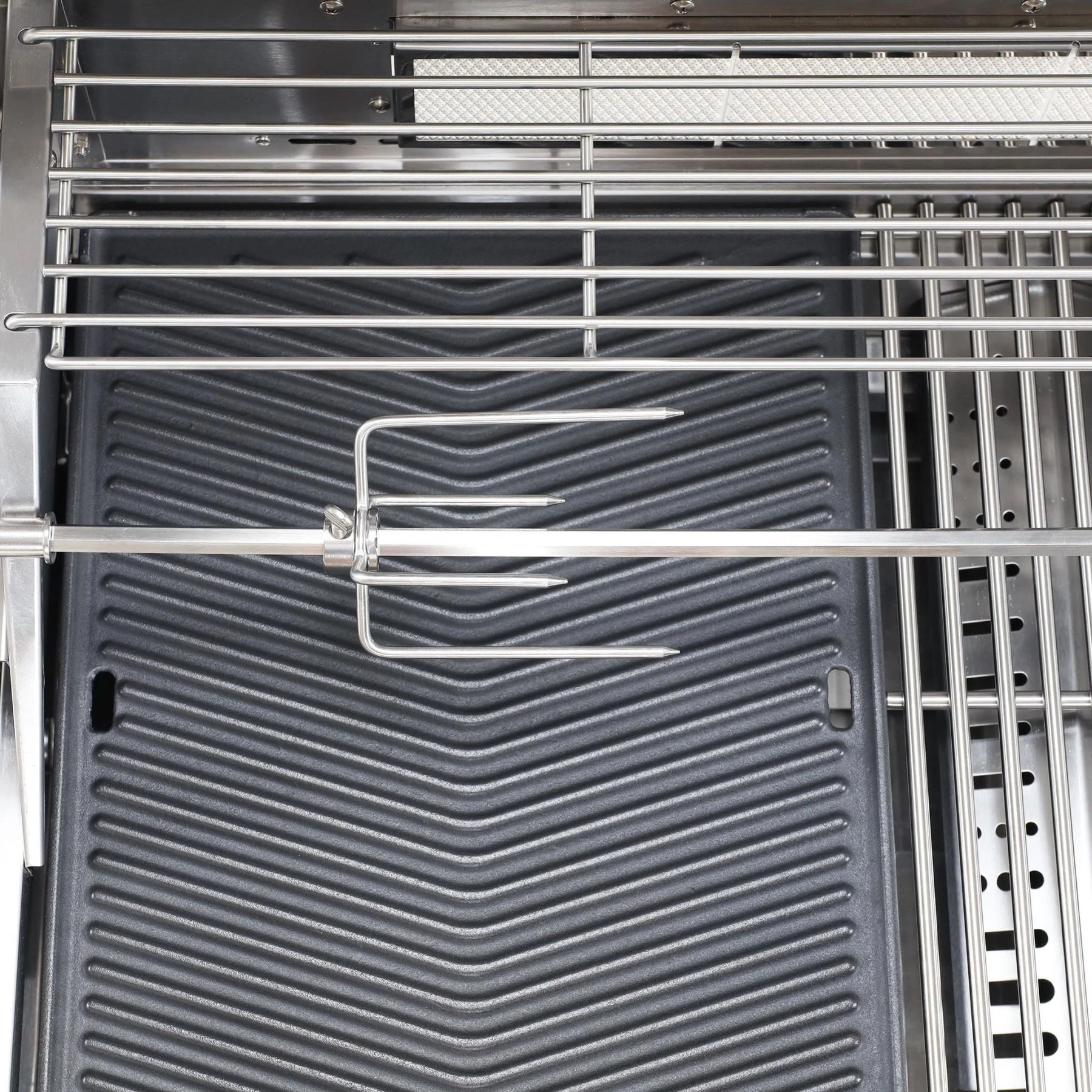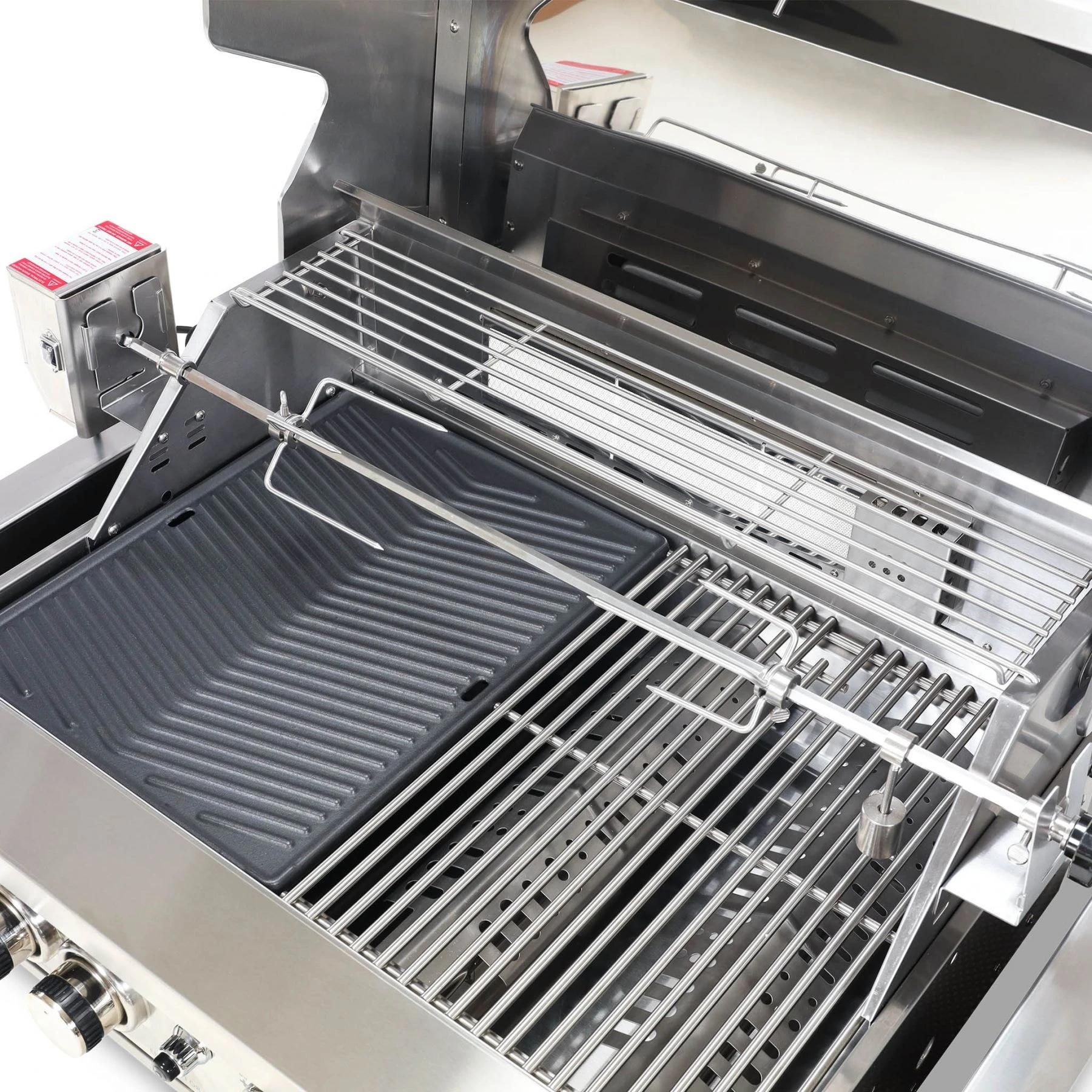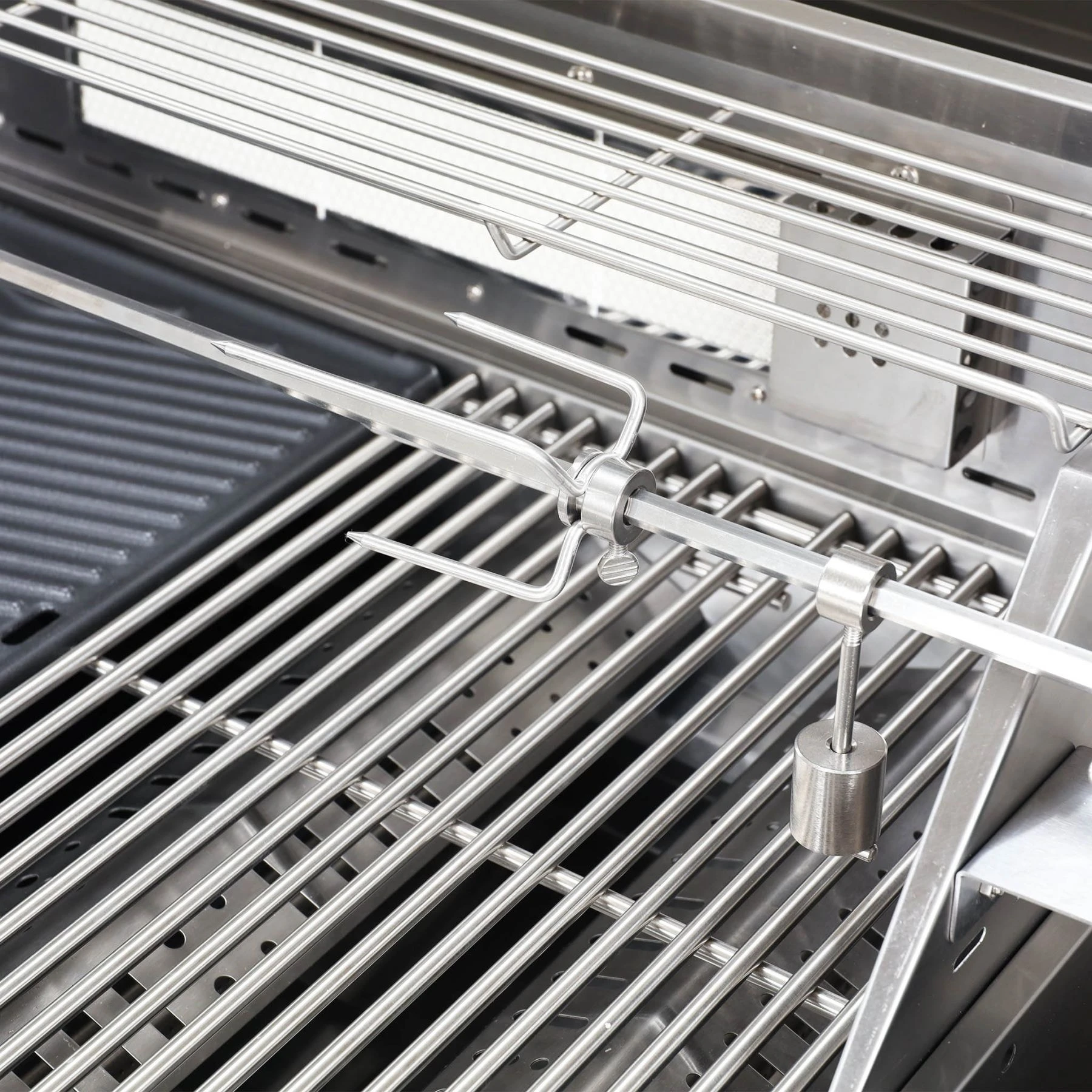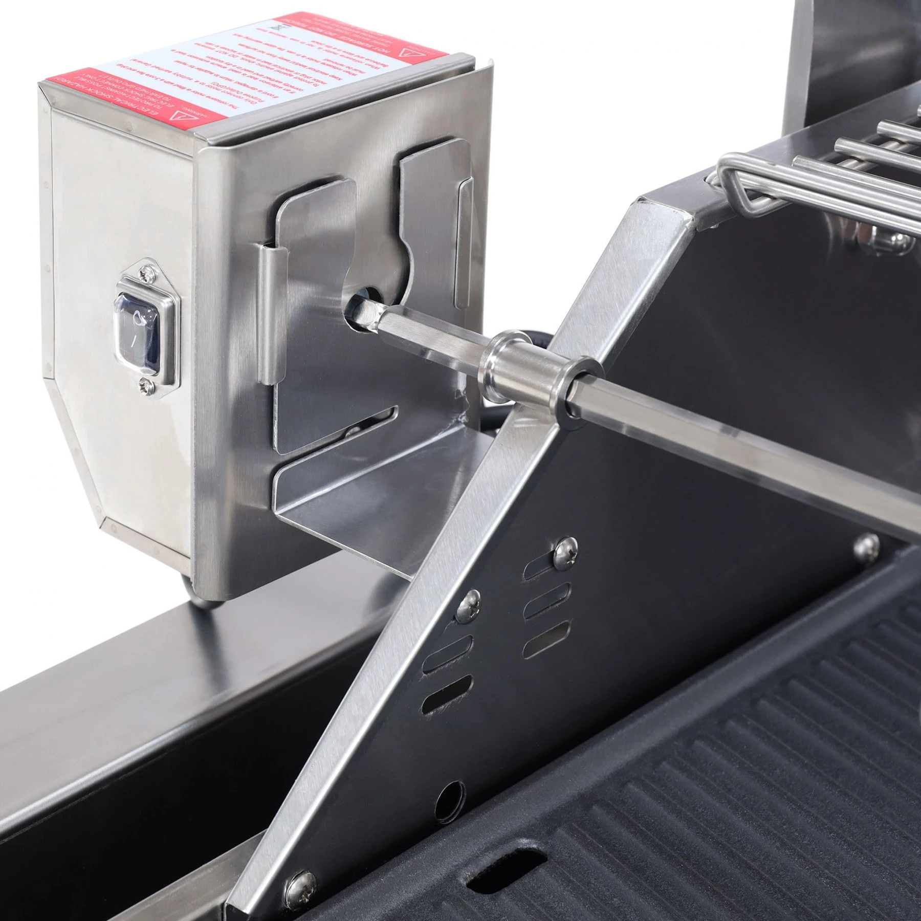 - Ett motoriserat grillspett Àr ett mÄste för alla som vill tillaga den perfekta grillade kycklingen! Med denna fiffiga rotisseri-funktion kan du lÄta en kyckling eller en stek sakta rotera över gasolgrillen medan den tillagas. InfrabrÀnnaren Àr placerad lÀngst bak i grillen, och vÀrmer djupt in i köttet med infravÀrme. Mycket funktionellt vid grillning av tjockt kött, och kan med fördel anvÀndas i kombination med grillspettet.