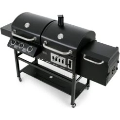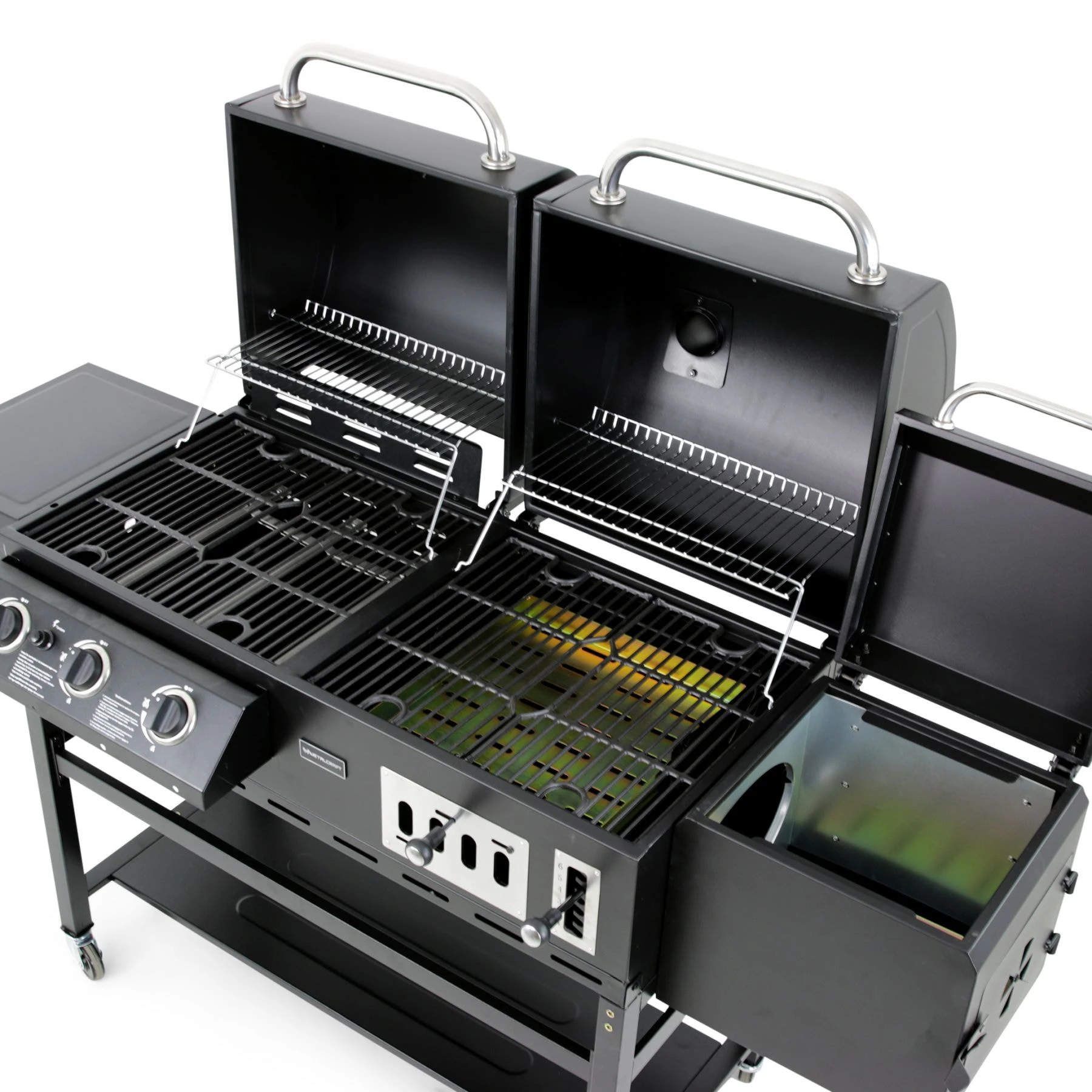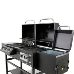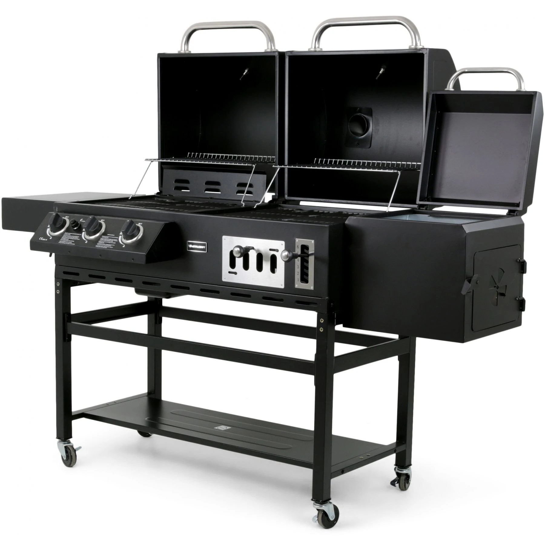 - Perfekt grill för dig som inte kan – eller vill – vĂ€lja mellan kolgrill eller gasolgrill. Denna grill erbjuder bĂ„de en kolgrill och en gasolgrill kombinerat, samt en rök, sĂ„ du dessutom kan anvĂ€nda grillen Ă€ven som rökgrill. Gasoldelen har tre rostfria brĂ€nnare pĂ„ totalt 10.5 kW effekt. Pulverlackat svart lock med rostfria handtag pĂ„ locken. Varje del av grillen öppnas med separat lock.