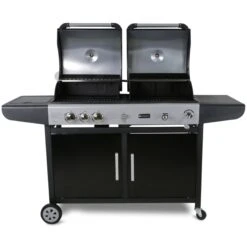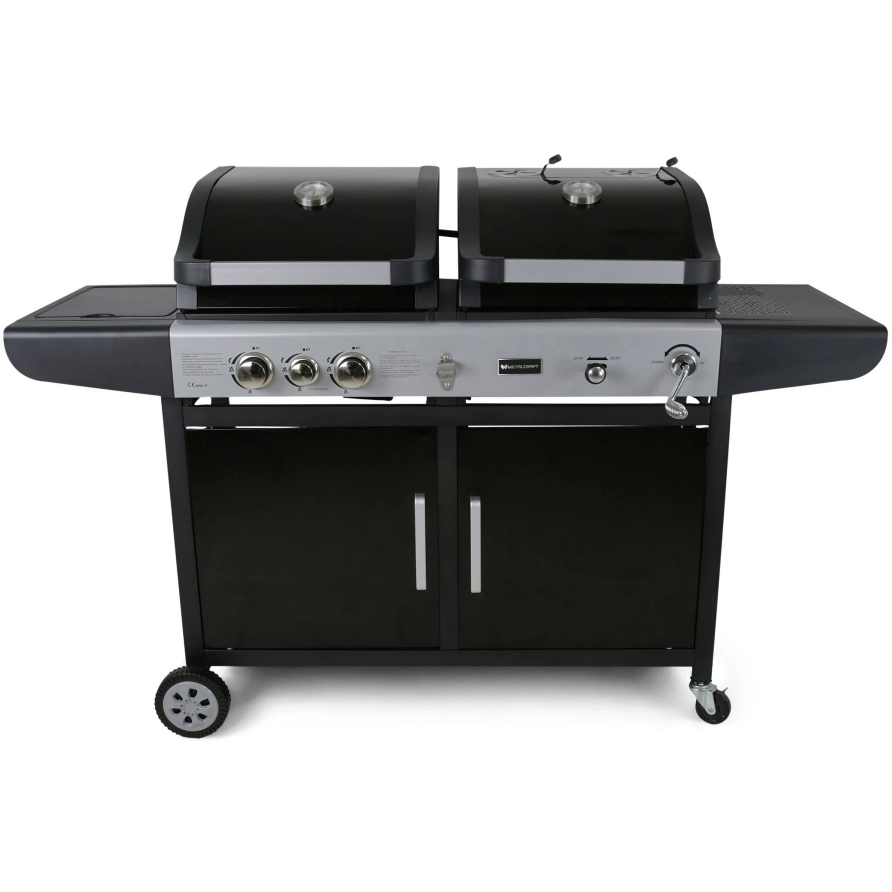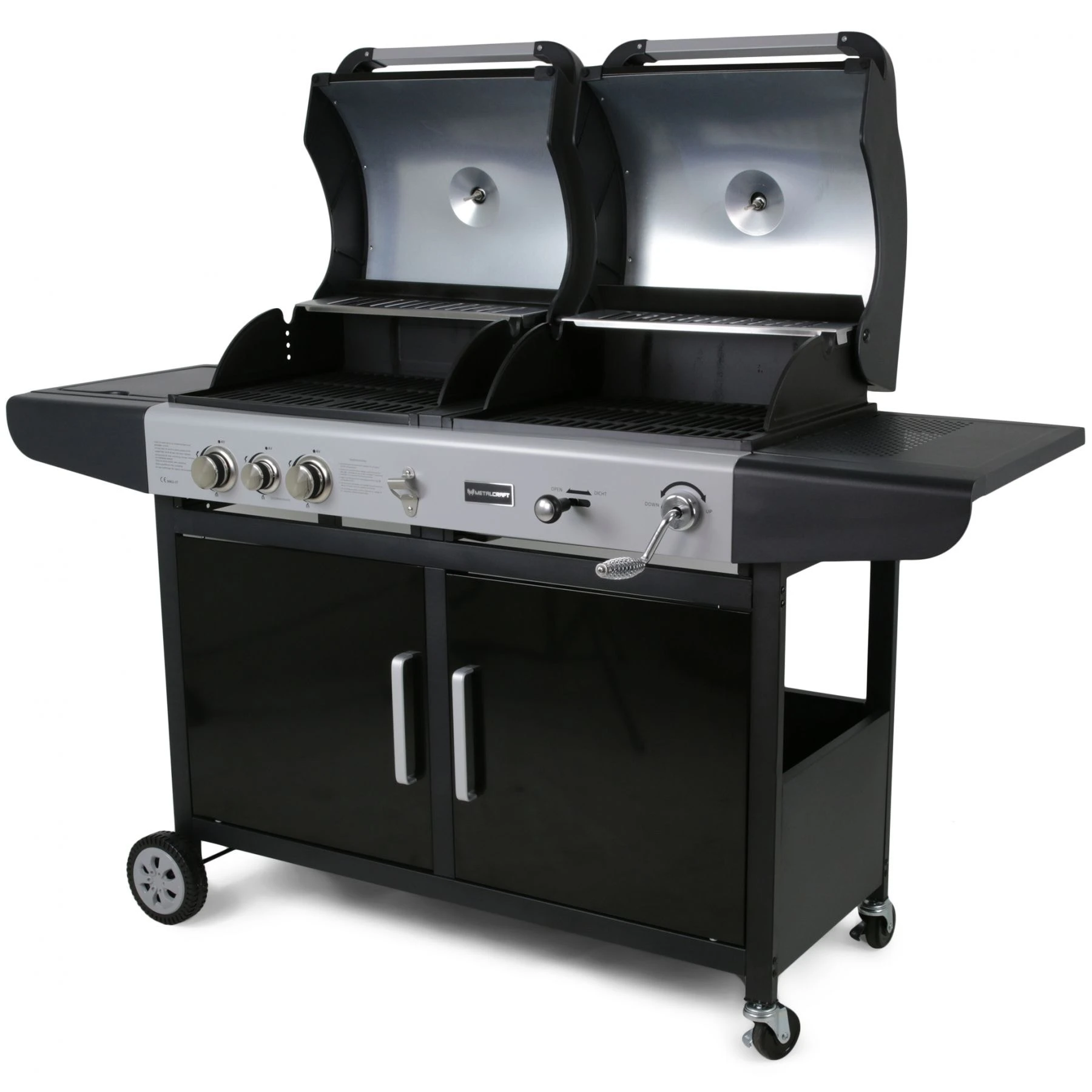 - Perfekt grill för dig som inte kan – eller vill – vĂ€lja mellan kolgrill eller gasolgrill. Denna grill erbjuder bĂ„de en kolgrill och en gasolgrill kombinerat. Gasoldelen har tvĂ„ rostfria brĂ€nnare och en sidobrĂ€nnare pĂ„ totalt 8.5 kW effekt. Pulverlackat svart lock och skĂ„pluckor. Rostfria handtag pĂ„ locken. Varje del av grillen öppnas med separat lock.