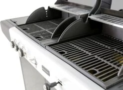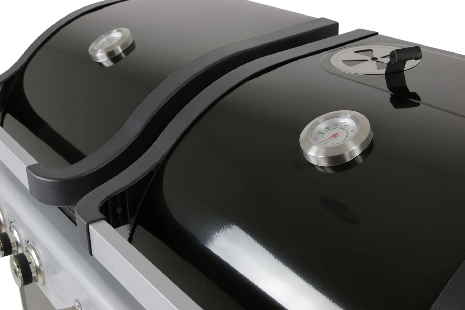 - Emaljerad grillskÄl. VarmhÄllningsgallret i rostfritt stÄl. Locket Àr pÄkostat med dubbla vÀggar för att locket inte ska bli sÄ varmt. PÄ varje lock finns en rostfri termometer som visar temperaturen i respektive del av grillen. UnderskÄpets vÀggar och sidoborden till grillen Àr tillverkade av svart pulverlackat stÄl. Gasolgrillen tÀnds enkelt med PiezotÀndning.