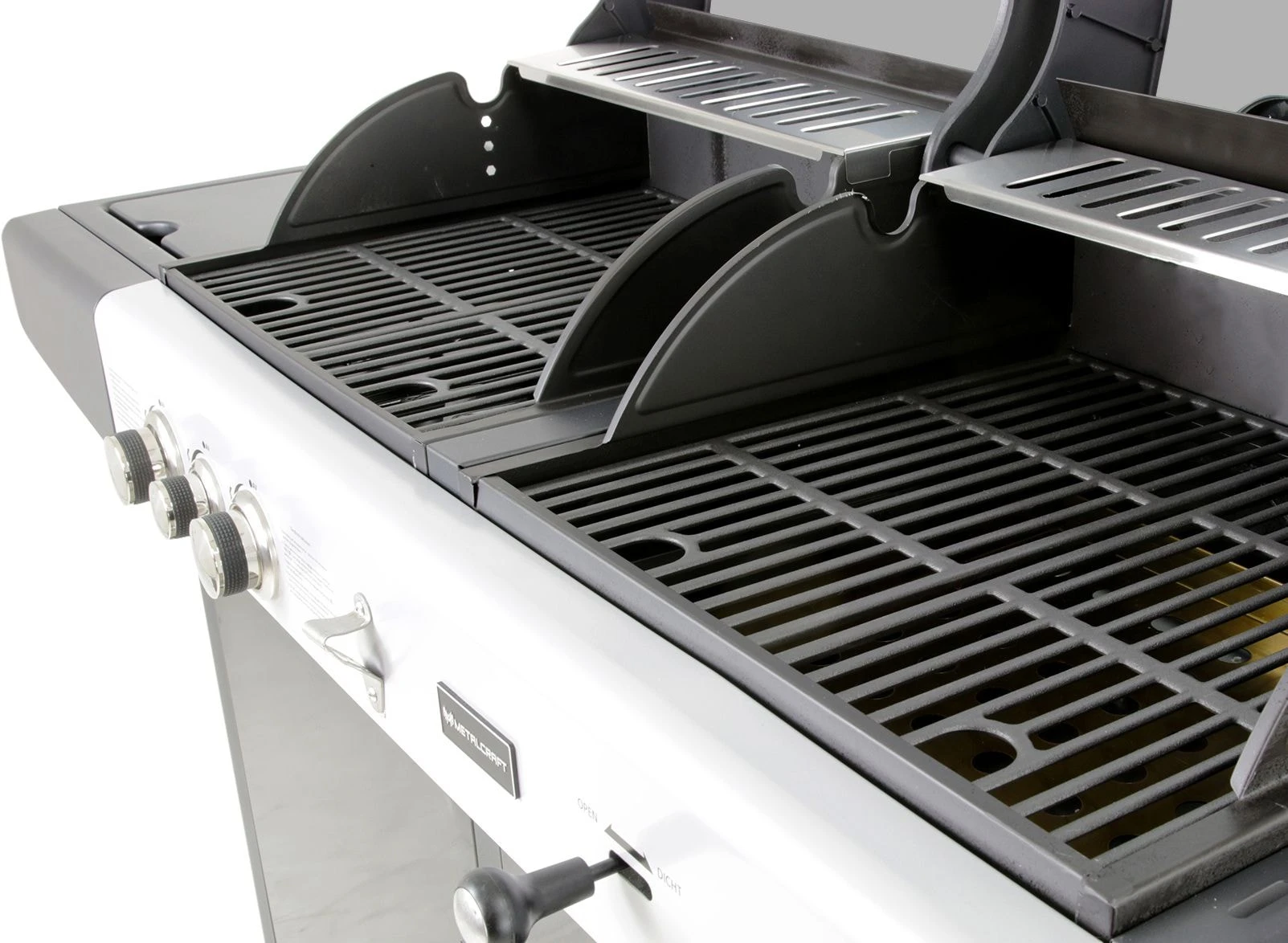 Perfekt grill för dig som inte kan – eller vill – vĂ€lja mellan kolgrill eller gasolgrill. Denna grill erbjuder bĂ„de en kolgrill och en gasolgrill kombinerat. Gasoldelen har tvÄ rostfria brĂ€nnare och en sidobrĂ€nnare pĂ„ totalt 8.5 kW effekt. Pulverlackat svart lock och skĂ„pluckor. Rostfria handtag pĂ„ locken. Varje del av grillen öppnas med separat lock.