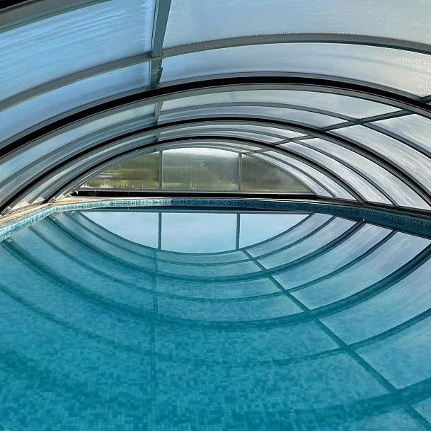Kraftigt och anvĂ€ndarvĂ€nligt pooltak för pool 5×10 m. Pooltaket har en skjutbar teleskop-konstruktion som gör att du enkelt skjuter ihop pooltaket nĂ€r det Ă€r dags för ett dopp. Och lika enkelt skjuter du över taket igen för att skydda poolen nĂ€r den inte anvĂ€nds.