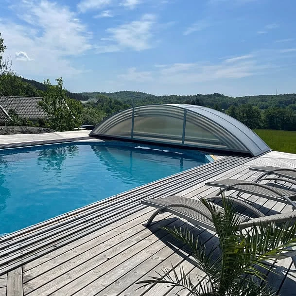 - Skjutbart pooltak för pool 5×10 m med teleskop-konstruktion