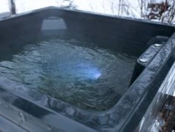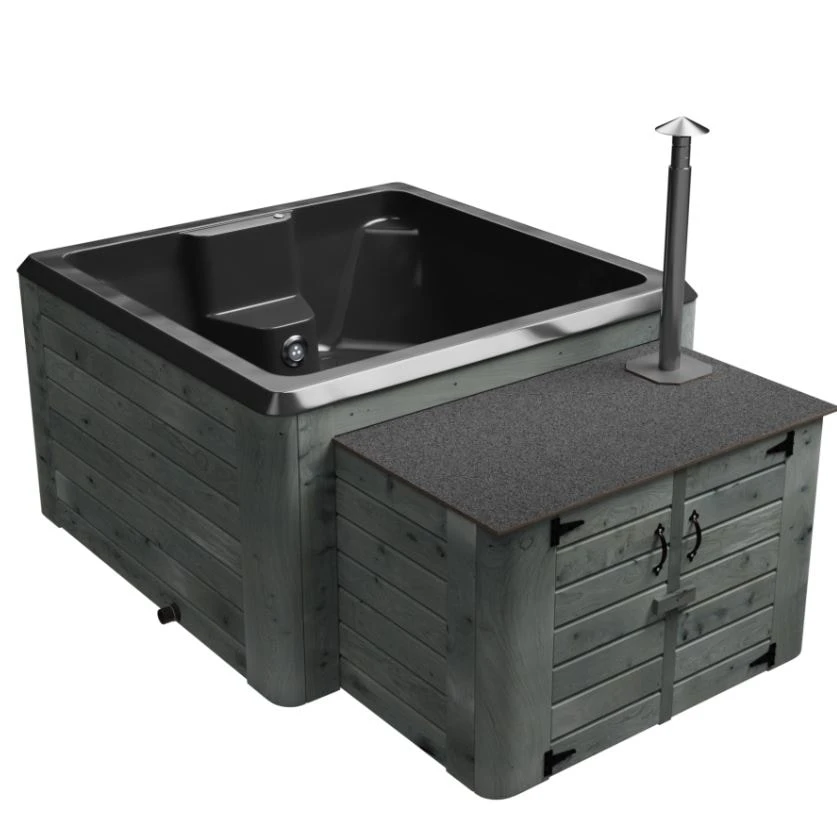 LeveransinnehÄll: Kvadratisk mörkgrÄtt glasfiberkar, lavagrÄ trÀram, Rexener Bioheater, isolering i polyuretan, massfiltreringspaket (inkl. cirkulationspump), LED-lampor, skyddslÄda (för vattenvÀrmare och massfiltreringspaket), bubbelserie