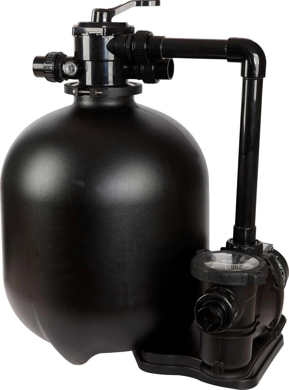 Filtersystemet bestÄr av en filtertank i vÀderbestÀndigt material och en stark sjÀlvsugande pump, som monteras pÄ den medföljande monteringsplattformen. Pumpen Àr utrustad med ett förfilter, som Àr en extra praktisk lösning i samband med backwash (returspolning ,rengöring av filtermaterialet). Tydliga instruktioner pÄ toppventilen gör systemet enkelt att hantera, och trycket i tanken under drift kan snabbt lÀsas av pÄ den integrerade manometern.
