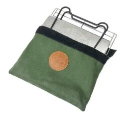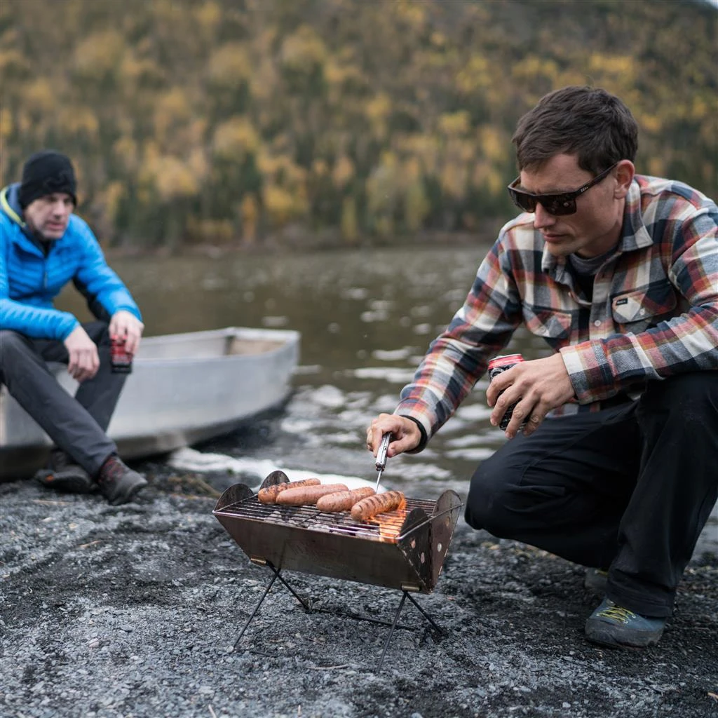 Du behöver bara fÀlla ut grillen och placera gallret ovanpÄ. Grillen Àr stabil och benen gör att elden kommer upp en bit frÄn marken. Sidorna pÄ grillen fungerar som vindskydd. Grillen kan ocksÄ anvÀndas som enbart eldstad. Levereras med fodral.